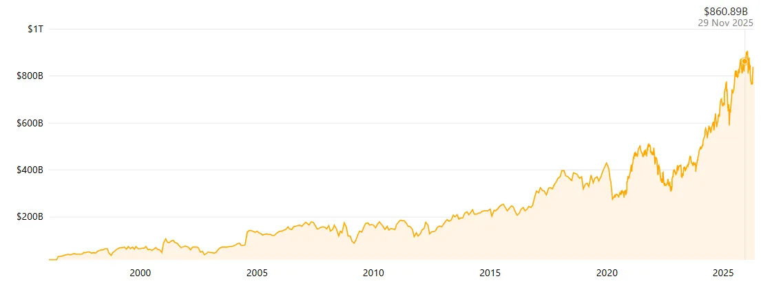 - Spoločnosť si drží trhovú kapitalizáciu cez 835 miliárd dolárov.