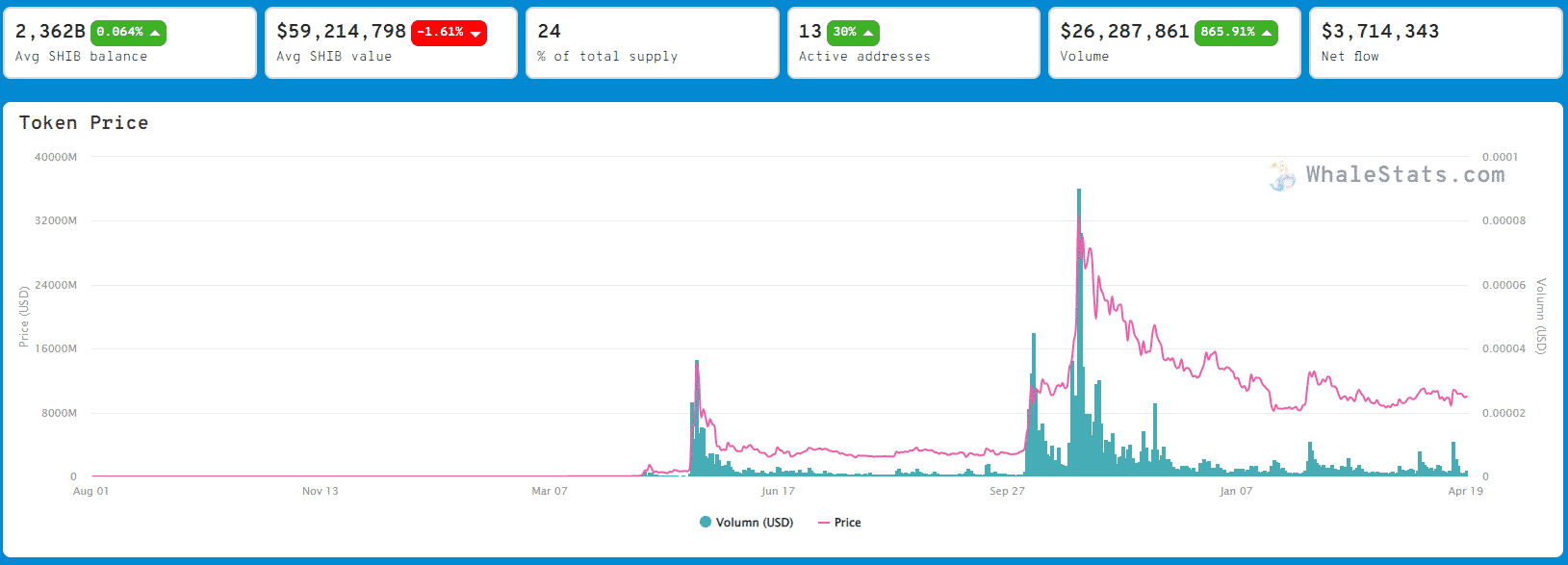 Po očakávanom zaradení Shiba Inu do obchodnej platformy Robinhood sa aktivita veľrýb postupne zvyšovala. Zvýšené interakcie s tokenom sa objavovali počas rastúcej nákupnej aktivity, čo ukazuje portál WhaleStats.