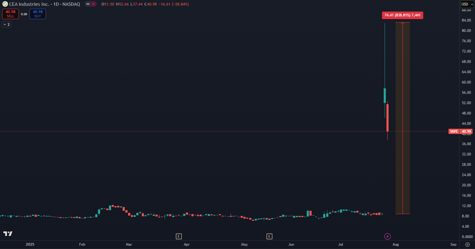 Akcie CEA Industries (VAPE) v pondelok odštartovali výnimočný rast, keď sa na začiatku obchodovania zvýšili o vyše 600 %. Dokonca v najvyššom bode dosiahla cena akcií VAPE zhodnotenie až o 838 %, no následne došlo k poklesu a po dosiahnutí maxima 82,88 dolárov nastal zostup na aktuálnu hodnotu 40,98 dolárov, ukazujú údaje TradingView.