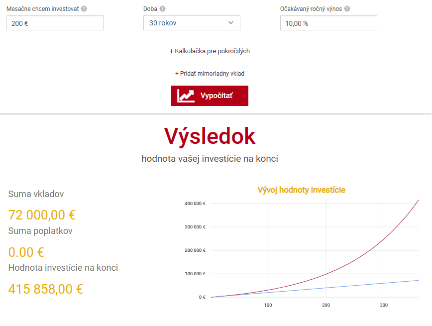 Po 30 rokoch pravidelných investícií dosiahla suma vkladov 72 000 eur a celkový účet 415 858 eur. Rozdiel medzi týmito sumami je zisk.