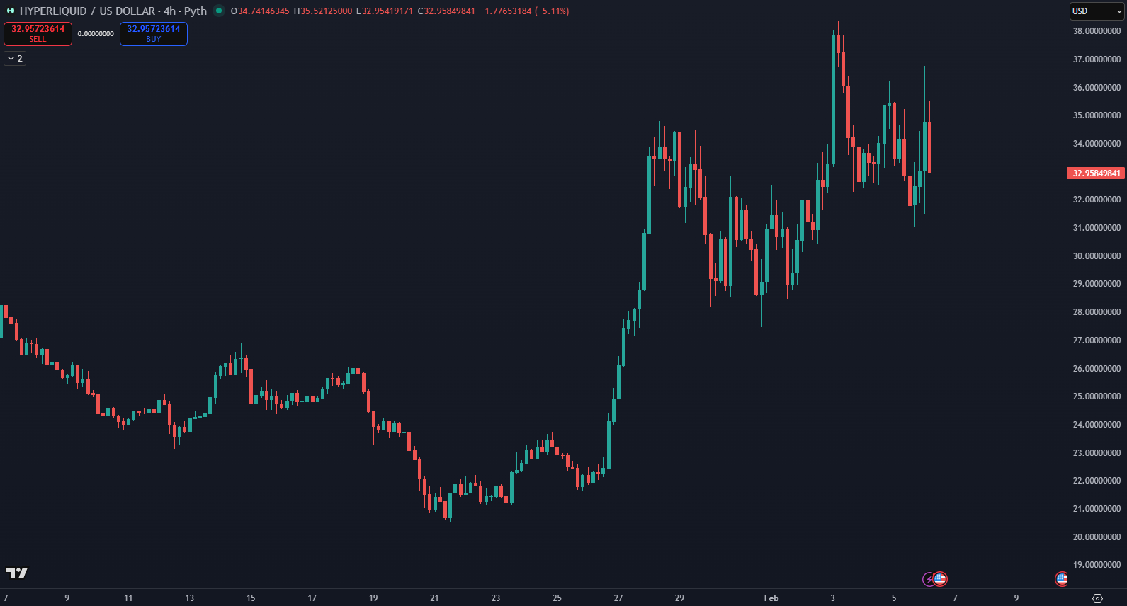 Dopyt po Hyperliquid vzrástol v dôsledku niekoľkých noviniek. 4. februára Ripple oznámila, že jej inštitucionálna platforma Ripple Prime pridala podporu pre Hyperliquid, čo umožňuje inštitúciám pristupovať k on-chain perpetuálnym a derivátom Hyperliquid a riadiť riziko spolu s tradičnými aktívami. Novinka vyvolala pozitívnu reakciu trhu a podporila rast HYPE aj napriek pretrvávajúcemu predajnému tlaku.