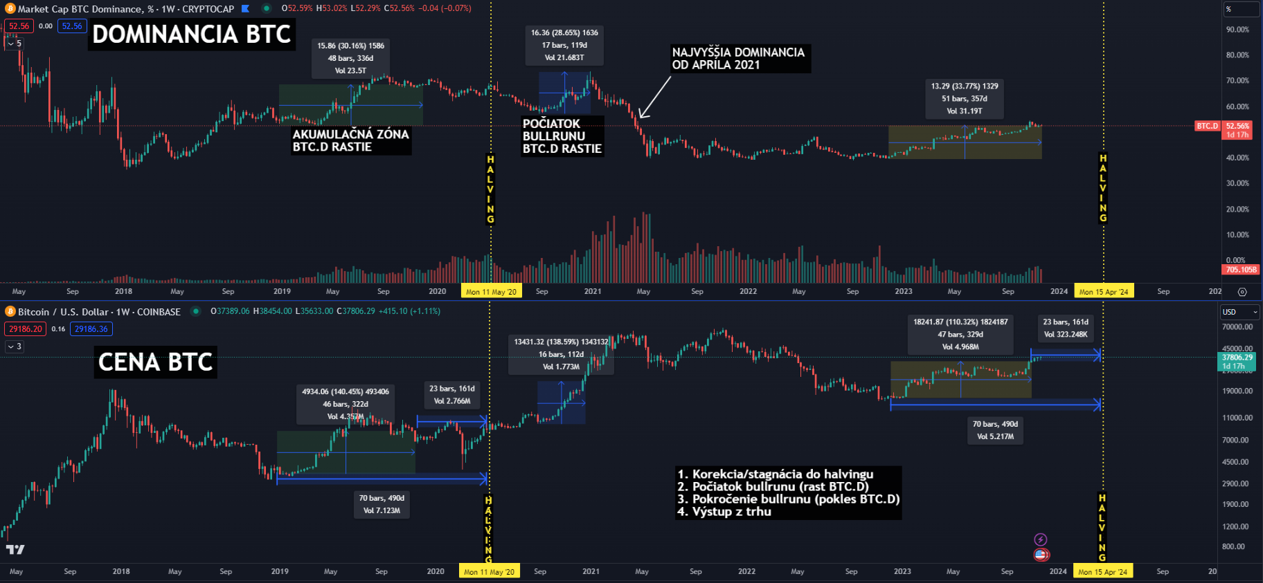 A teraz sa dostávame k pointe, prečo je porovnávanie dominancie a ceny vo vzťahu k halvingu také dôležité. Vieme totiž jednoducho identifikovať, či sa trh nachádza v bullrune, respektíve v inej fáze. Bullrun znamená, že dominancia Bitcoinu klesá a cena všetkých kryptomien rastie. Inak povedané, altcoiny preberú iniciatívu a dosahujú vyššie zisky ako Bitcoin.