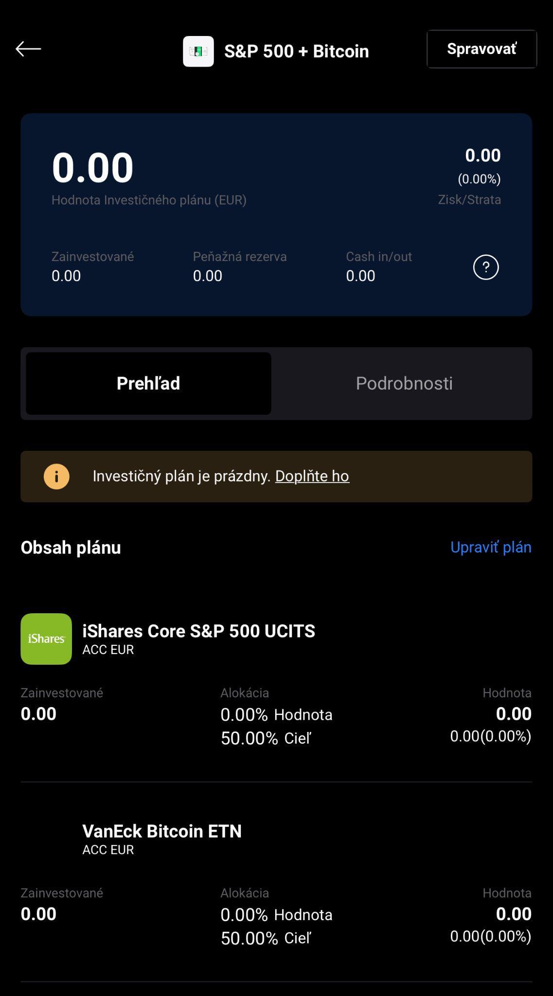 V mobilnej aplikácii jednoducho nastavíte ETF, ale aj kombináciu ETF, ktoré chcete nakupovať, periodicitu a systém za vás bude ETF pravidelne nakupovať. V príklade vyššie môžete vidieť investičný plán, kde sme nastavili investovanie do ETF S&P 500 a VBTC v pomere 50:50. Opäť teda môžete ťažiť z rastu trhu s kryptomenami aj nákupom ETF.