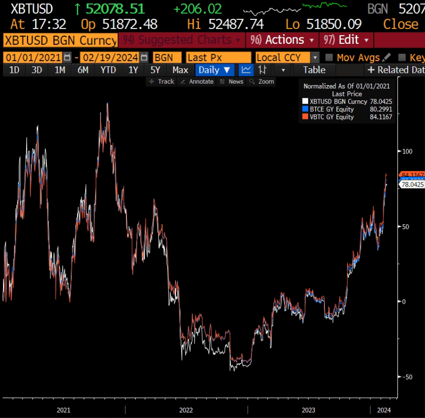 Predovšetkým tým, že tieto ETF veľmi presne kopírujú cenu Bitcoinu. Keď sa pozrieme na výkonnosť BTC ako takého (biela farba na grafe nižšie) a porovnáme ju s výkonnosťou daných ETF dostupných v ponuke XTB (modrá a oranžová farba), zistíme, že ceny podkladového aktíva ETF sa navzájom pomerne presne kopírujú.