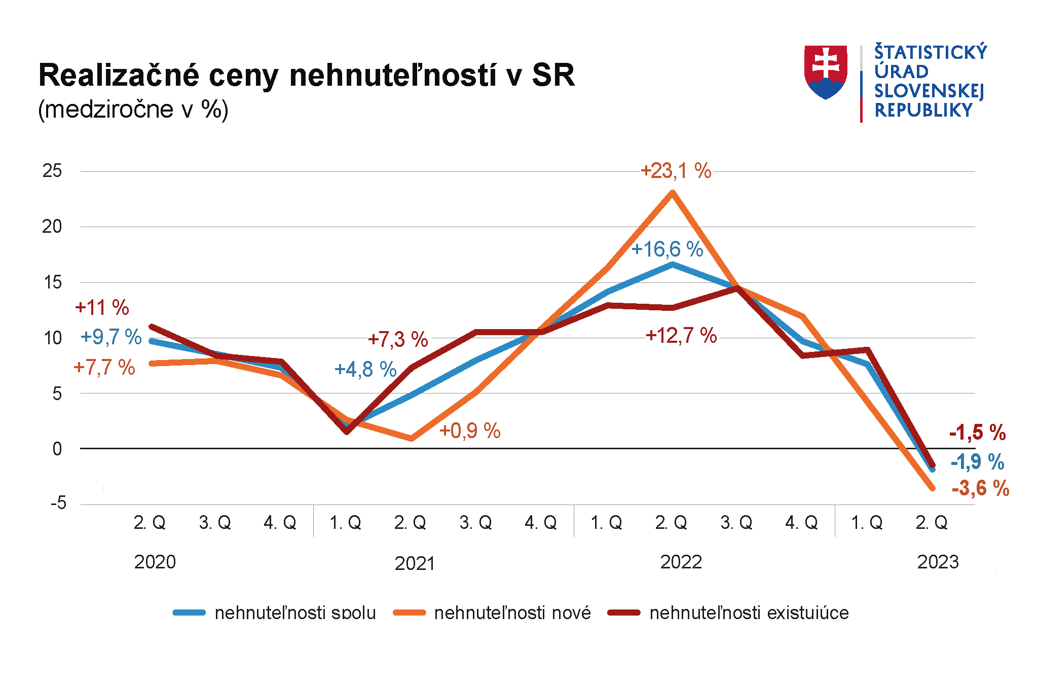 Výraznejšie sa prepadli ceny novostavieb, ich realizačná cena medziročne poklesla o 3,6 %. Staré nehnuteľnosti zlacneli v porovnaní s rovnakým obdobím minulého roka o 1,5 %.