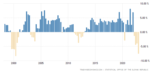 Už skôr sme vás informovali, že reálne mzdy na Slovensku klesli na 22 ročné minimum. Podľa údajov Tradingeconomics v štvrtom štvrťroku klesla až o 7,6 %, čo predstavuje 4 poklesy v rade a zároveň najväčší prepad od druhého štvrťroka 2000. Masívny pokles miezd pocítili na úrovni 14 až 15 % v stavebníctve a v ubytovacích a stravovacích službách.