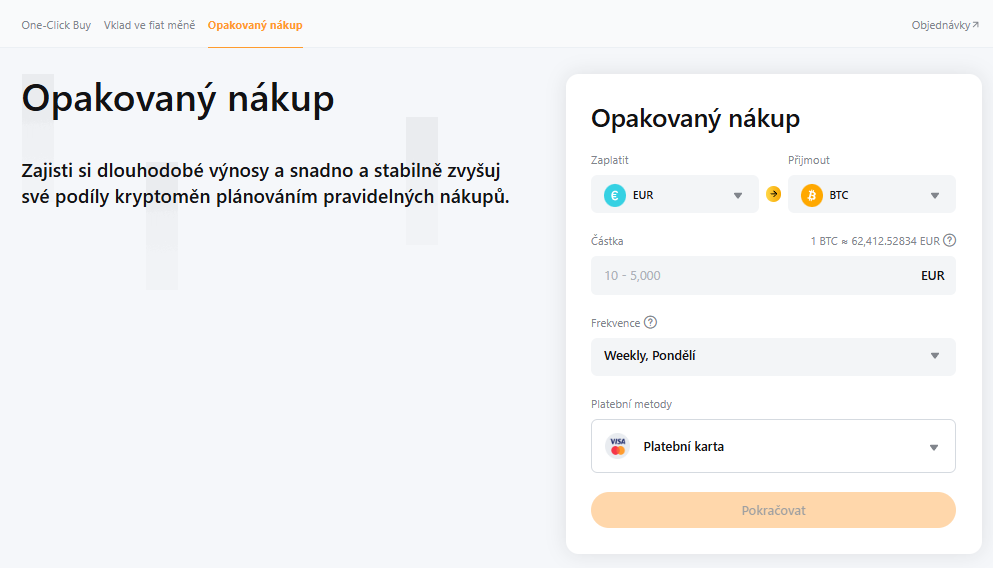 Funkcia Opakovaný nákup umožňuje nastaviť automatické nákupy Bitcoinu v pravidelných intervaloch. Investor si zvolí sumu a frekvenciu a systém následne realizuje nákupy bez potreby ďalšieho zásahu. Takýto prístup podporuje stratégiu postupného budovania portfólia a eliminuje snahu časovať trh.