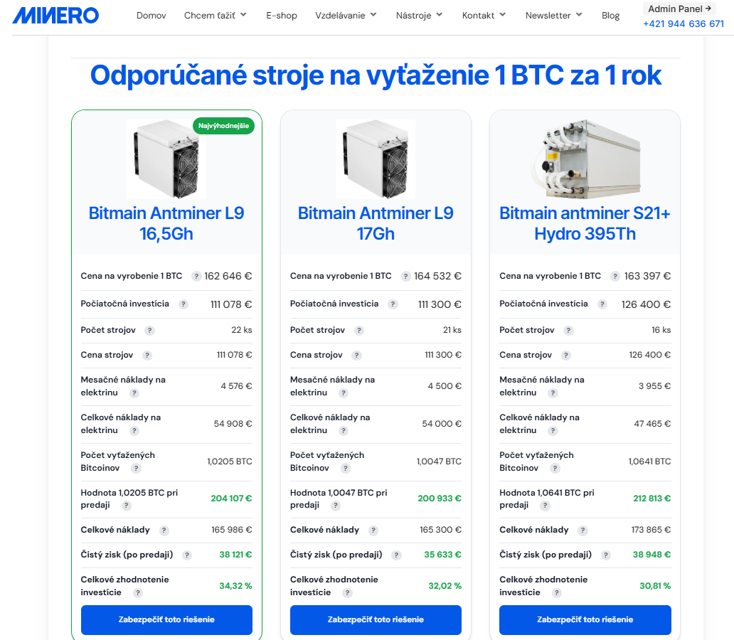 - Reálny výnos závisí najmä od ceny Bitcoinu a nákladov na elektrinu.