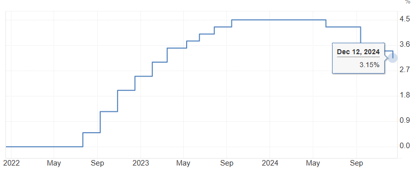 Podľa údajov TradingEconomics sa ECB rozhodla v decembri 2024 po 4-krát v tomto roku znížiť svoje kľúčové úrokové sadzby o 25 bázických bodov na 3,15 %, ako sa očakávalo. Tento krok odráža priaznivejší výhľad inflácie a zlepšenie transmisie menovej politiky. Očakáva sa, že inflácia bude postupne klesať s prognózami 2,4 % v roku 2024, 2,1 % v roku 2025 a 1,9 % v roku 2026.