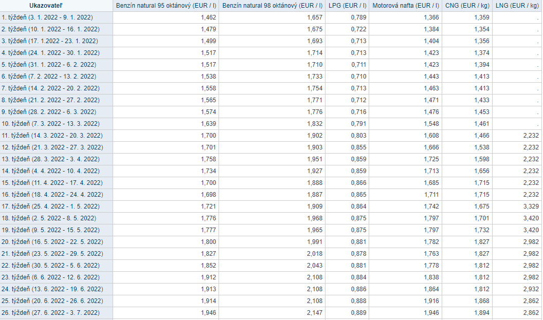 Nasledujúca tabuľka zobrazuje vývoj PHM na Slovensku od začiatku roka 2022. Ako vidíme, rast sa zastavil iba na niekoľko týždňov, ale ceny opäť stúpajú. Tento vzostup by však mal byť potlačený koncom júla, a to z dôvodu poklesu ceny ropy.
