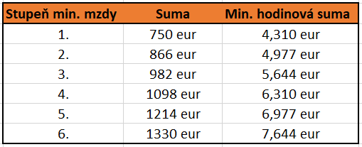 Zvyšovať sa bude práve podľa stupňa náročnosti, ktorých je celkovo šesť a ku každému je priradený koeficient minimálnej mzdy. Tabuľka nižšie zobrazuje jednotlivé stupne a výšku minimálnej hodinovej mzdy.