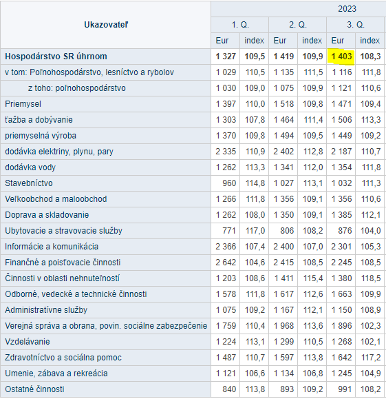 Za mesiac október stúpli platy rýchlejšie ako tempo rastu cien vo všetkých odvetviach. Takýto trend sme naposledy mohli vidieť v auguste 2021. Najviac stúpli platy v reštauráciách a pohostinstvách (9,8 %) a v priemysle (4 %). Od začiatku roka rástli reálne mzdy celkovo v 5 z 10 sledovaných odvetví. Rovnako narástla aj priemerná mesačná nominálna mzda o 8,3 % na úroveň 1 403 eur.
