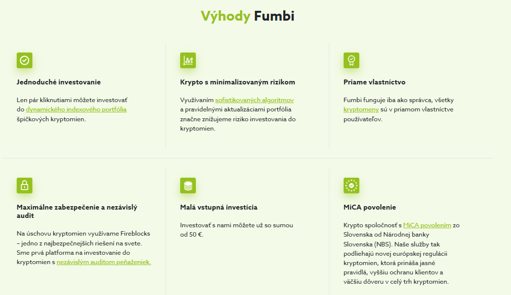 Dáva tak investorom istotu, že nimi vybraná spoločnosť pôsobí v súlade s jednotnou reguláciou EÚ a dodržiava všetky pravidlá riadenia rizík, bezpečnosti a ochrany klientskych vkladov. Fumbi je jednou z prvých slovenských kryptoinvestičných spoločností, ktorá splnila všetky prísne požiadavky a dostala povolenie MiCA. Bude tak pôsobiť pod dohľadom Národnej banky Slovenska.