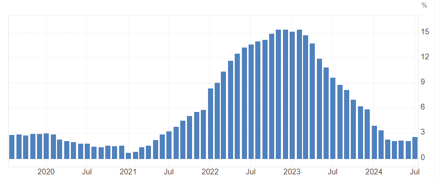 Naposledy bola inflácia pod 2 % v eurozóne v apríli 2021. Posledný rok sa pohybuje tesne pod úrovňou 3 %, a presne to isté platí aj pre Slovensko. Dokonca za júl 2024 u nás medzimesačne stúplo tempo rastu cien o 0,5 %, ukazujú údaje Tradingeconomics. ECB aj FED budú rozhodovať o uvoľnení menovej politiky už v septembri.