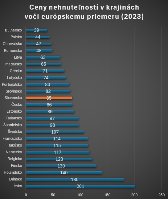 Zatiaľ čo na Slovensku dosahujú ceny nehnuteľností 85 % európskeho priemeru, v Česku je to 86 %, Rakúsku 115 %, Maďarsku 65 % a Poľsku len 44 %. Najnižšia úroveň 39 % je v Bulharsku a najviac zaplatia obyvatelia Írska (201 %) a Dánska (180 %).