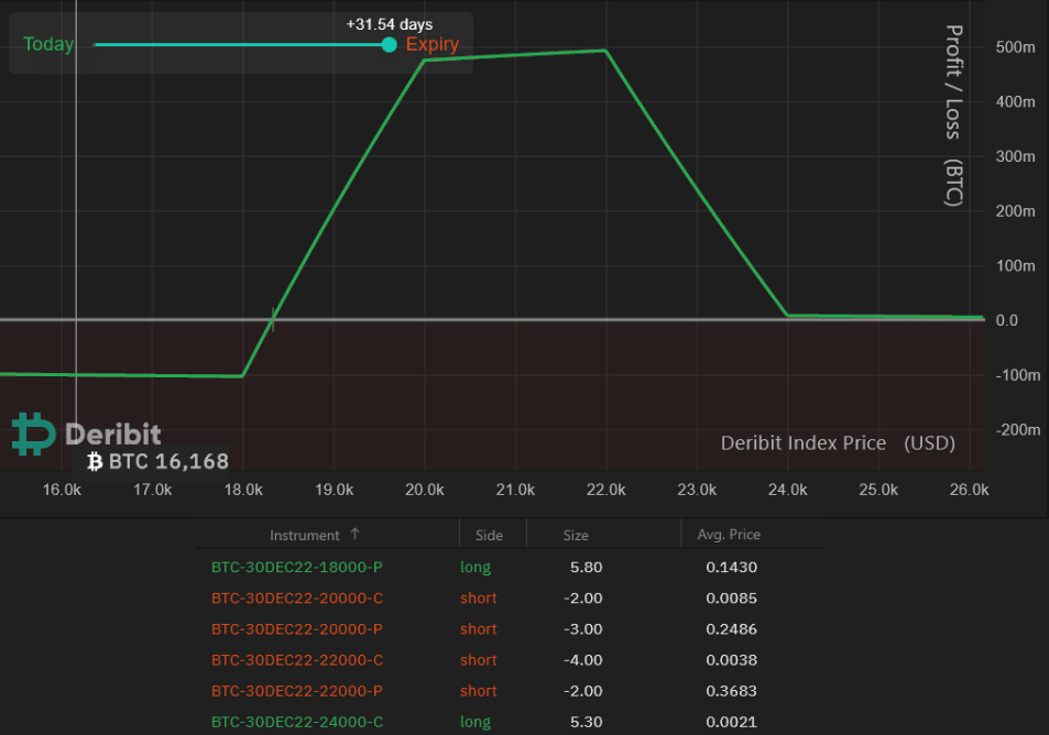 Uveďme si jednoduchý príklad na základe kontraktov pre 30. december 2022. Obchodníci predpokladajú cieľovú oblasť BTC medzi 18 350 dolárov až 24 000 dolárov. Aby ste mohli vstúpiť do obchodu, musíte predať 2 kontrakty call opciį na 20 000 dolárov a 2 kontrakty na put opcie s cenou 20 000 dolárov. Následne musíte zopakovať tento postup pre opcie s cenou 22 000 dolárov, pričom použijete rovnaký dátum exspirácie. Na to, aby ste sa chránili pred poklesom, musíte nakúpiť ešte 5,8 kontraktu predajnej opcie s cenou 18 000 dolárov. A vo finále je nutné nakúpiť 5,3 kontraktu kúpnej opcie s cenou 24 000 dolárov.