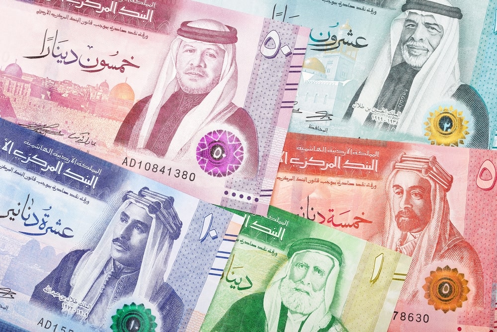 Jordánsky dinár slúži ako jordánska mena od roku 1950, keď nahradil palestínsku libru. Jedna jednotka jordánskeho dinára predstavuje hodnotu 1,41 dolára. Pevný výmenný kurz a diverzifikovaná ekonomika sú hlavnými dôvodmi, prečo je táto mena taká hodnotná. Jordánsky dinár je od roku 1995 pevne naviazaný na americký dolár kurzom 1,41.