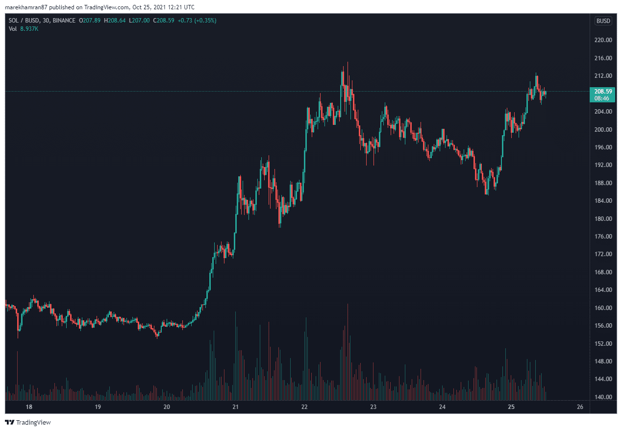 V čase písania tohto článku sa token SOL pohyboval na cenovej úrovni 207,37 USD, čiže už len krok od historického maxima, ktoré je na hodnote 213 USD. Aktuálny bullrun dokázal token SOL vystreliť na šiestu priečku v rebríčku portálu CoinMarketCap, ktorý sleduje celkovú trhovú kapitalizáciu. Ripple je tak odsunutý na siedme miesto.