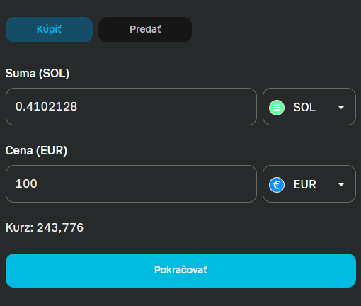 Za predpokladu, že plánujete obchodovať kryptomenu Solana alebo aj iné digitálne meny, odporúčame vám burzu Anycoin. Spoločnosť umožňuje používateľom nakupovať a predávať široké spektrum kryptomien (viac ako 200) v eurách alebo českých korunách, čo ju robí obľúbenou medzi slovenskými a českými používateľmi. Obrázok nižšie zobrazuje jednoduchý nákup Solany na Anycoine.