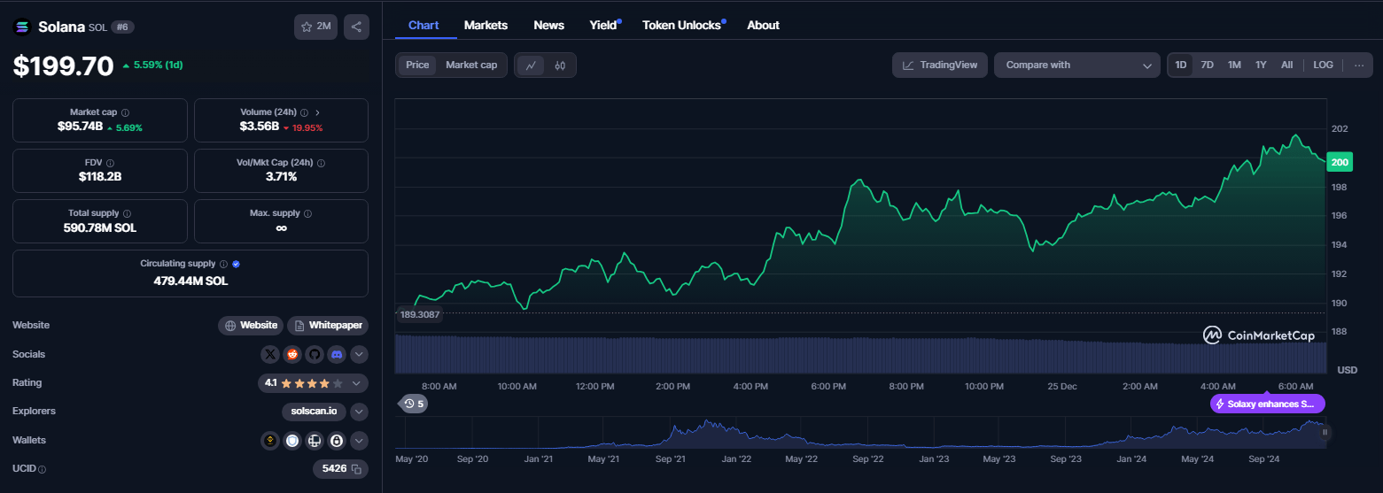 PR článok Minotaurus. Kryptomena Solana (SOL) sa opäť dostala nad hranicu 200 dolárov, čo predstavuje kľúčový míľnik v jej nedávnej transakčnej aktivite. Pri 24-hodinovom náraste ceny o 5,4 % je aktuálna cena Solany 199,56 dolárov. To necháva ľudí uvažovať o ďalšom pohybe.