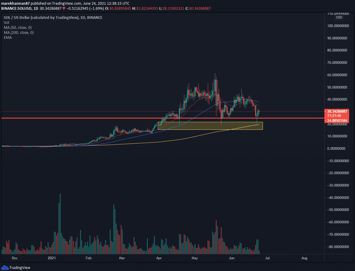 Posledný prepad tokenu SOL zaznamenal silný support, ktorý bol otestovaný hneď tri krát. Ako môžeme vidieť na grafe support bol zaznamenaný na úrovni žltého obdĺžnika a červenej horizontálnej línie.