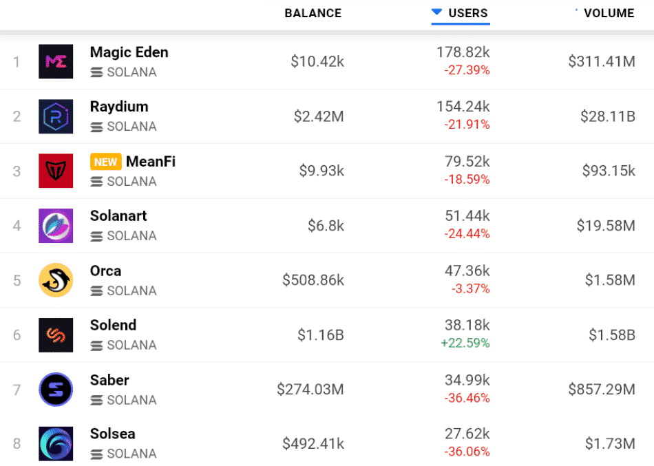 Ako ukazujú údaje DappRadar, 28. januára počet sieťových adries Solana interagujúcich s decentralizovanými aplikáciami klesol v priemere o 18 %. Jedinou pozitívnou zmenou bol Solend, algoritmický protokol požičiavania.
