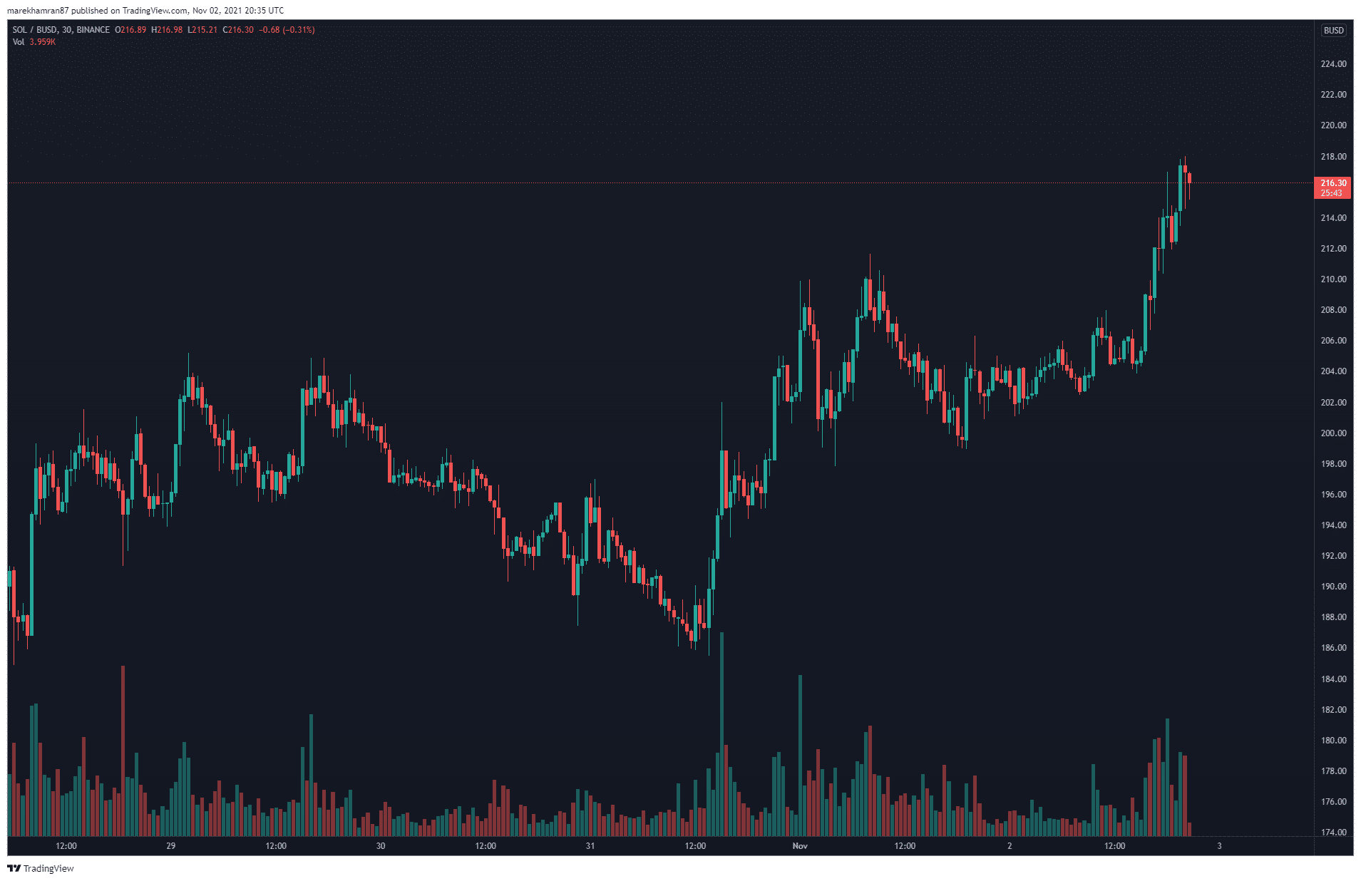 To, čo sieť Solana zažila pred pár týždňami, by sa už nemalo opakovať. Výpadok dokázal cenu tokenu stiahnuť o desiatky percent, čo, samozrejme, negatívne ovplyvnilo aj náladu investorov. Zdá sa však, že sa všetko vracia do starých koľají. Solana len pred pár dňami dosiahla historické maximum 219,05 USD. V čase písania tohto článku bol zaznamenaný výrazný nákupný ošiaľ, pričom cena bola len mierne pod ATH na úrovni 217 USD.