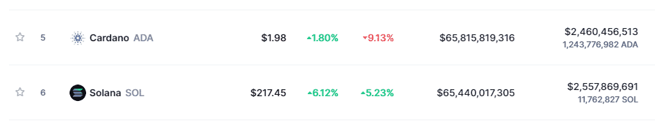 Sieť Solana bola v jednom momente na piatom mieste rebríčka podľa trhovej kapitalizácie. Ekosystém Cardano sa však ubránil. Aktuálne je medzi piatym a šiestym miestom nepatrný rozdiel. V čase písania tohto článku bola trhová kapitalizácia SOL na úrovni 65,4 miliárd USD. V prípade siete ADA je to 65,8 miliárd USD.