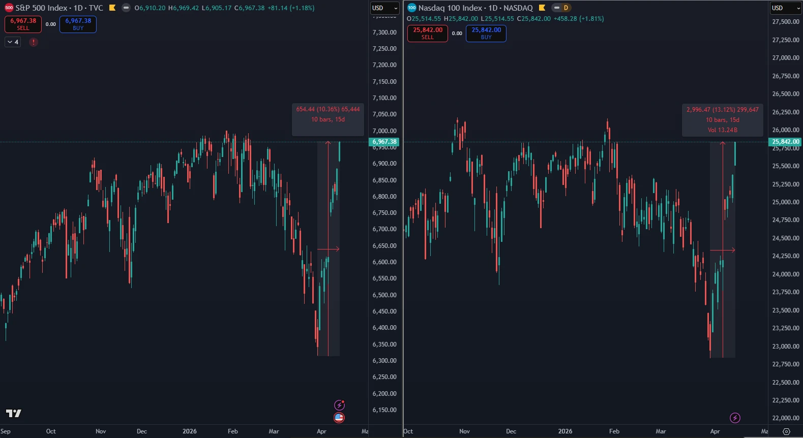 Za posledné dva týždne narástol S&P 500 o 10,36 % a Nasdaq 100 o 13,12 %. Oba indexy tak v krátkom čase vymazali celý marcový prepad. Kľúčové nie je len samotná výška rastu, ale predovšetkým jeho tempo v porovnaní s predchádzajúcim poklesom. Trh pred týmto rastom klesal dvakrát pomalšie a napriek tomu investori dokázali všetky straty dohnať za jediné dva týždne. Táto výrazná asymetria medzi rýchlosťou poklesu a rýchlosťou následného rastu hovorí jasnou rečou: kupujúci pevne ovládajú trh. Predávajúci nedokázali udržať tlak, a len čo sa sentiment obrátil, dopyt rýchlo prevládol. Takáto dynamika je pre analytikov signálom sily, nie náhody.