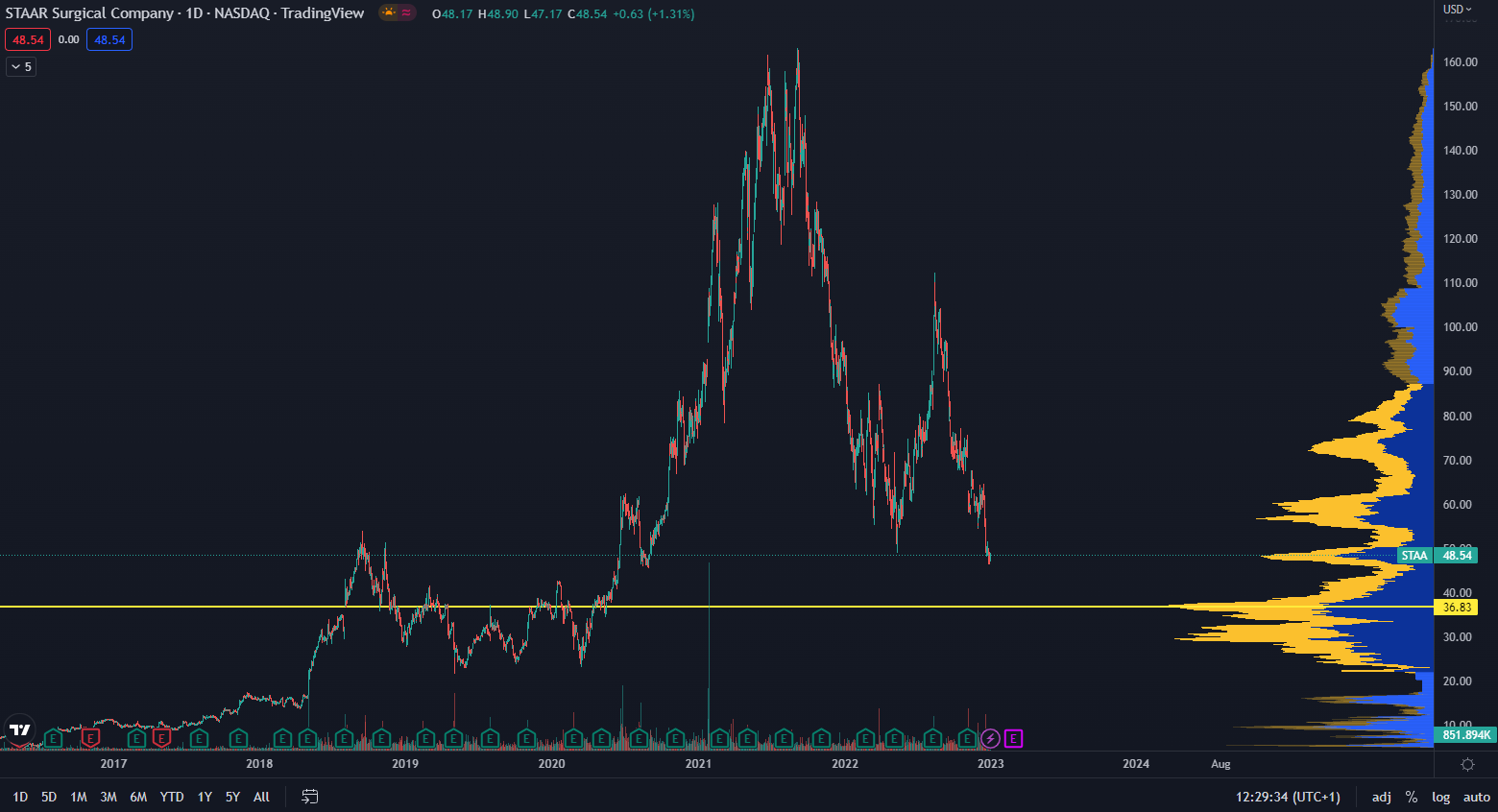 Na grafe nižšie môžeme vidieť, že cena akcií STAAR Surgical je dlhodobo v korekcii na úrovni 48,54 dolára. Od septembra 2021 klesla už o viac ako 70 % a zdá sa, že korekcia sa blíži do záverečnej fázy. Hlavnou oblasťou supportu je predovšetkým interval od 30 do 40 dolárov. Naposledy sa na rovnakej cenovej úrovni akcie obchodovali v septembri 2020.