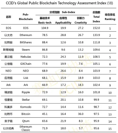 Tridsaťtri kryptoprojektov bolo zaradených na základe ich základnej technológie, použiteľnosti a tvorivosti, ako aj z celkového pohľadu. V kategórii tvorivosti je BTC uvedený na vrchole. Spoločnosť EOS je prvá v kategórii základnej technológie, zatiaľ čo Ethereum je prvé v kategórii použiteľnosti.