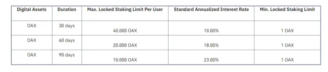 Binance oficiálne spustil ďalšiu staking akciu s odmenou až do 23 %. Od 03.08.2021 môžete stakovať kryptomenu OAX s p.a. až do 23 %. Stačí vám iba jediné – mať vytvorený účet na Binance, vlastniť mincu OAX a ísť do sekcie staking.