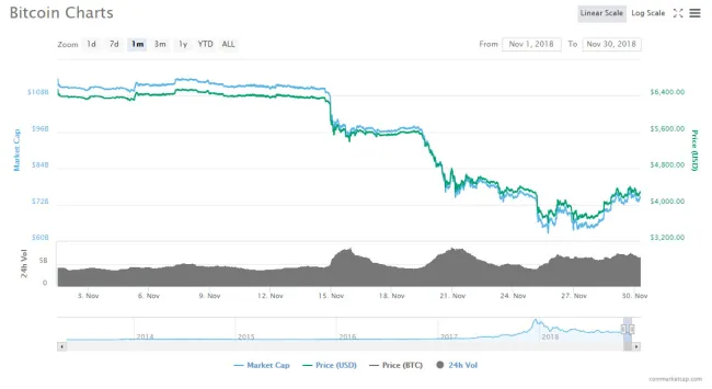 Pokiaľ ide o trhovú kapitalizáciu, Bitcoin stratil približne 40 miliárd dolárov, pretože od začiatku mesiaca klesol zo 113 miliárd dolárov na 74 miliárd dolárov na konci tohto obdobia. Bitcoin nebol v novembri jediný. Podobne na tom bolo viacero ďalších altcoinov, pričom napríklad Ethereum dumplo z 200 dolárov na 104 dolárov. Viac sa dočítate tu: https://www.newsbtc.com/ (v angličtine).