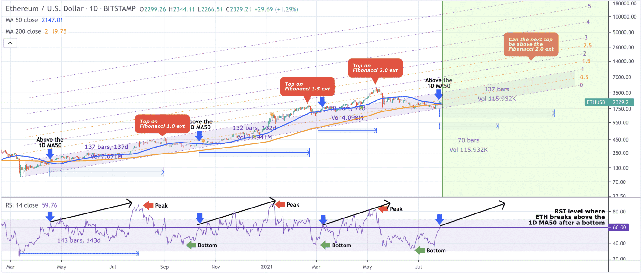 Spoločnosť sa opiera o fraktálnu analýzu, podľa ktorej môžeme sledovať vývoj ceny Etherea v cykloch. Pokiaľ by táto analýza mala byť platná, tak sa cena môže už vo veľmi blízkej budúcnosti dostať na 14 000 dolárov.
