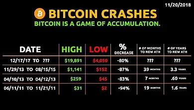 Bitcoin je od začiatku roka v medveďovom trende. V posledných týždňoch jeho cena klesla ročné minimum. To je dôvod, prečo sa celý trh obáva toho, čo sa s Bitcoinom môže stať v blízkej budúcnosti. Táto situácia tu však nie je prvýkrát. V rokoch 2011, 2013 a 2014 existovali rôzne bubliny, ktoré sa následne rozpadli. Používateľ twitteru, Dennis Parker, sa rozhodol nahrať grafiku, v ktorej je možné vidieť minulé pády Bitcoinu. Ukazuje, že súčasný trh zaznamenal korekciu vo výške 80 %.