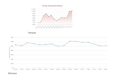 Len dva týždne po prekročení 500.000 transakcií denne dosiahol TRON (TRX) ďalší míľnik. Na prelome 2. až 3. novembra sprocesovala táto sieť, ktorá pôvodne vznikla na blockchaine Etherea, až jeden milión transakcií. Spustenie vlastného mainnetu, akvizícia BitTorrentu, podpora decentralizovaných aplikácií ako aj neustály upgrade siete tak pomohol Tronu predbehnúť svojho konkurenta (Ethereum) v počte spracovaných transakcií v priebehu jedného dňa. Z obrázku nižšie je vidieť, že kým Ethereum za posledné týždne spracováva štandardne 500 až 600-tisíc transakcií, Tron svoje limity posúva vyššie a vyššie.