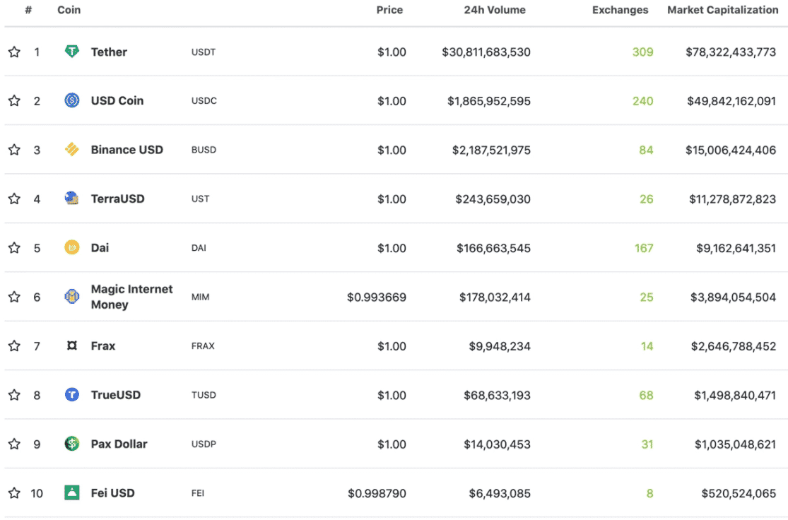 TOP 10 stablecoinov podľa trhovej kapitalizácie. Zdroj: CoinMarketCap
