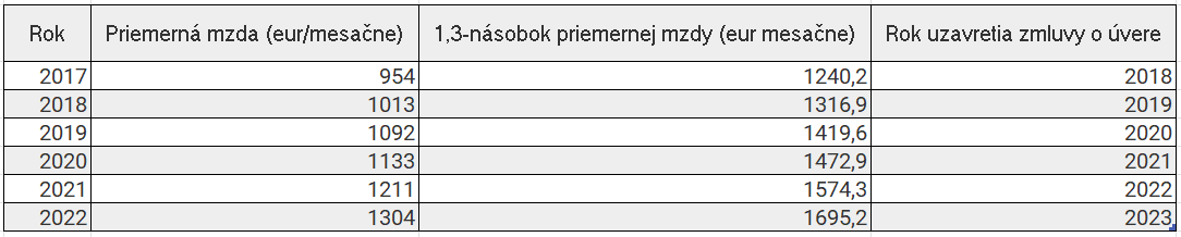To znamená, že ak klient zobral hypotéku v roku 2023, kľúčové sú príjmy z roku 2022. Platí, že 1/12 celoročného príjmu nesmie prekonať 1,3-násobok priemernej mzdy za rok 2022 (1 695 eur). Ak dlžník spĺňa túto podmienku, má nárok na bonus počas ďalších 5 rokov. Tabuľka nižšie zobrazuje porovnanie aj s predošlými rokmi.