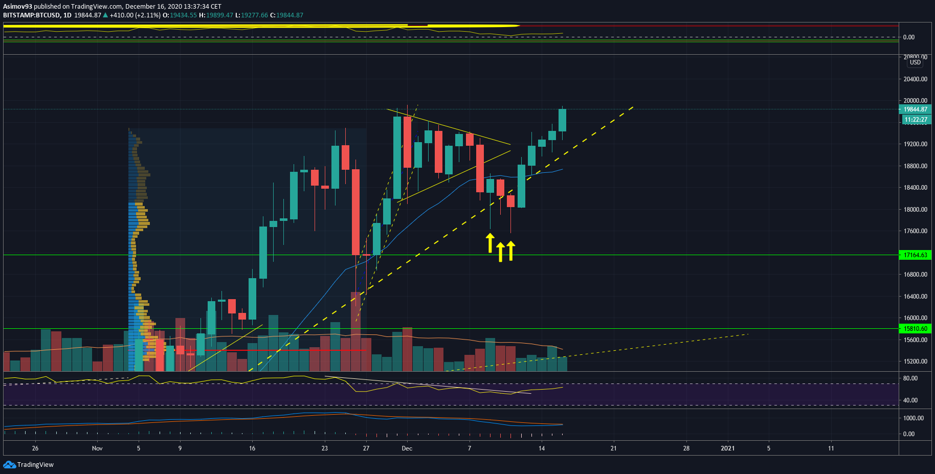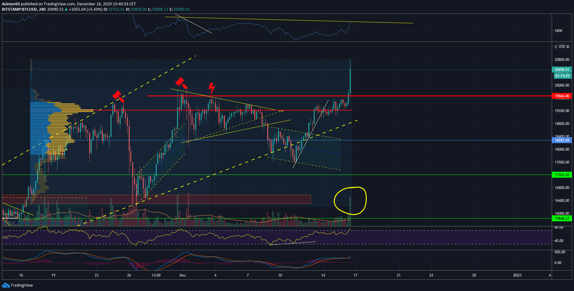 Situácia sa od poslednej analýzy na Bitcoin zase dramaticky zmenila. Bitcoin dokázal vcelku rýchlo postúpiť späť, odkiaľ pôvodne padol. Cena prvýkrát v histórii prekonala magickú hranicu 20 000 $ a tlačí sa stále vyššie.