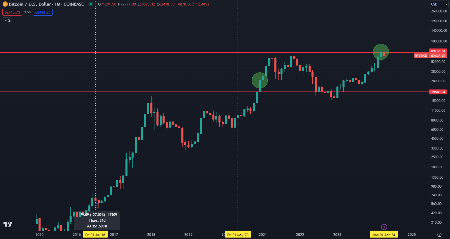 Vždy v minulosti platilo, že Bitcoin prekonal ATH (all time high- najvyššia dosiahnutá cena v histórii) až niekoľko mesiacov po halvingu. Pri tomto cykle sme boli svedkami unikátneho prelomenia ATH, keďže sa to Bitcoinu podarilo už pred touto udalosťou. Na grafe nižšie môžeme vidieť, že cene to v predošlom cykle trvalo vyše pol roka po halvingu.