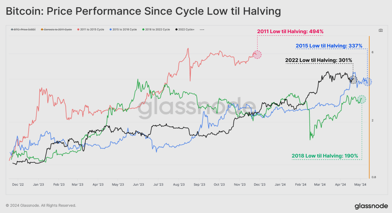 Z tohto skorého prelomenia ATH by sme mohli usúdiť, že Bitcoin rastie omnoho rýchlejšie ako predošlé cykly. Opak je však pravdou. Ak sa totiž pozrieme na zisky Bitcoinu od dna každého cyklu po halving, zistíme, že Bitcoin v tomto období stúpol o 301 %. Porovnanie ziskovosti za toto obdobie vidíte na grafe nižšie a jasne ukazuje, že výkonnosť BTC v tomto cykle nie je vyššia ako v minulosti, ale skôr sa drží priemeru.
