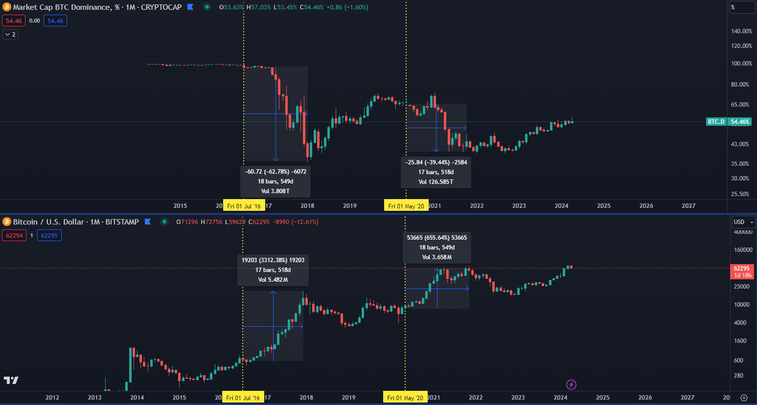 Vždy platí, že po halvingu cena Bitcoinu pokračuje v raste, no dominancia výrazne klesá. Presne tento vzťah vidíme na grafe nižšie v posledných 2 cykloch. Teraz sme svedkami situácie, kedy Bitcoin dlhodobo rastie nie len na dominancii, ale aj cenovo. Ak tento trend bude pokračovať aj najbližšie mesiace, pôjde o unikátny jav.