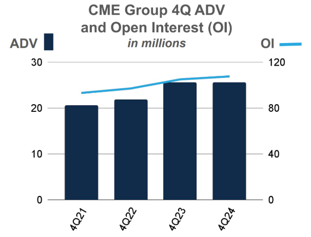V štvrtom štvrťroku 2024 dosiahla CME Group (americká burza derivátov) priemerný denný objem obchodovania s kryptomenovými derivátmi približne 10 miliárd dolárov, čo predstavuje viac než 300 % nárast oproti predchádzajúcemu roku, uvádza správa Cointelegraph.