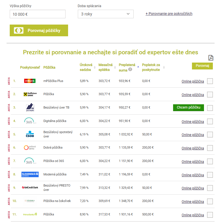 Prehľad preplatkov na úrokoch pri pôžičke 10 000 eur na 3 roky. Zdroj: financnykompas.sk