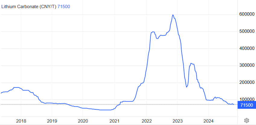 Ceny uhličitanu lítneho klesli v októbri na 71 500 CNY (čínsky juan) za tonu, čo je najnižšie od marca 2021, keďže nadmerná kapacita batérií pre elektrické vozidlá v Číne viedla výrobcov k zníženiu požadovaných cien vstupov v rámci celého dodávateľského reťazca.