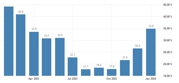• Inflácia v Zimbabwe je na úrovni 34,8 % za január 2024.