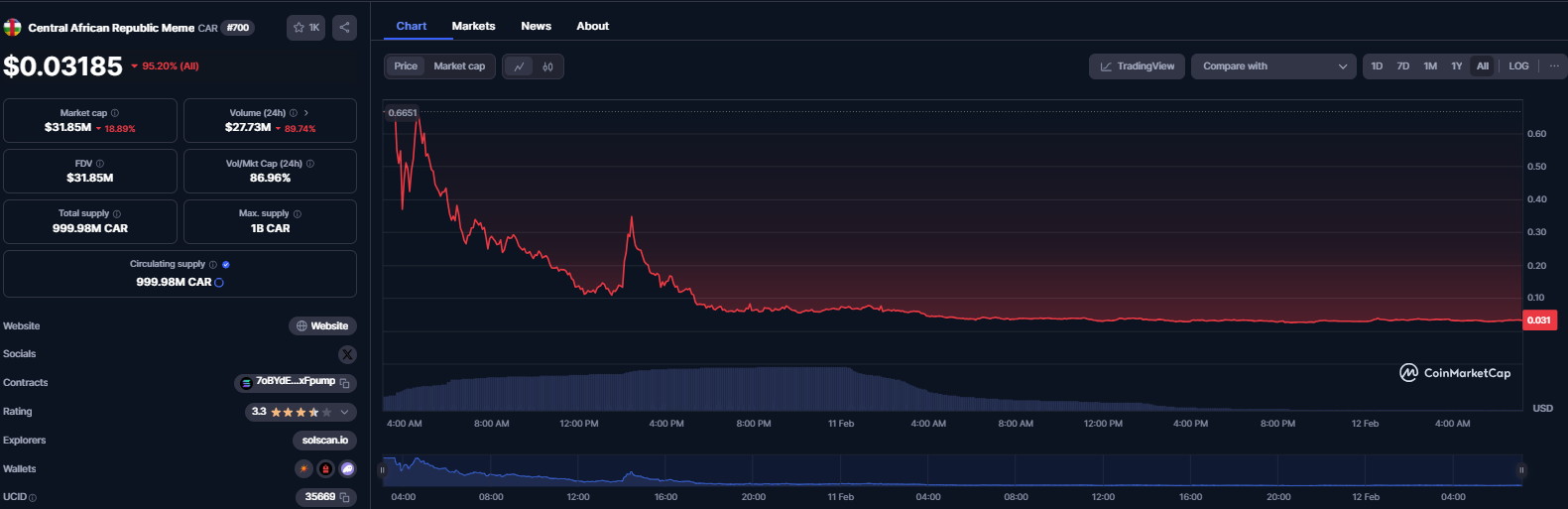Podľa správy magazínu Finbold Stredoafrická republika prekvapila svet predstavením národnej meme kryptomeny s názvom Central African Republic Meme (CAR). Prezident Faustin-Archange Touadéra oznámil túto iniciatívu 10. februára, pričom ju označil za „experiment“ zameraný na podporu národného rozvoja.