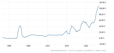 Argentína podľa údajov Tradingeconomics zaznamenala medziročnú infláciu na úrovni 108,8 % a každým mesiacom rastie. Menový úrad zaviedol pre spoločnosti nové obmedzenia, vrátane predĺženého čakacieho času na príjem dolárov za regulovanú, lacnejšiu sadzbu. Znepokojenie v krajine rastie aj napriek cenovým kontrolám a pravidelnému zvyšovaniu sadzieb.