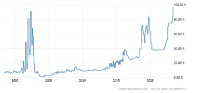 Ako vidíme na grafe nižšie, základná úroková sadzba v Argentíne v čase písania článku dosahuje až 97 % a prekonáva tak 20-ročné maximum. Od 8. augusta 2018 je referenčnou sadzbou menovej politiky sadzba 7-dňových likviditných poukážok (LELIQ), no od 6. januára 2022 sa úroková sadzba používaná pre menovú politiku zmenila na 28-dňové obdobie.