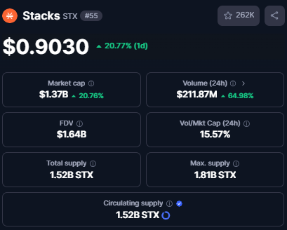 STX je v čase písania 55. najväčšia kryptomena na svete s celkovou trhovou kapitalizáciou na úrovni 1,36 miliardy dolárov. Denný objem obchodovania stúpol na 211,89 milióna dolárov, čo predstavuje až 15,61 % z celkovej kapitalizácie.
